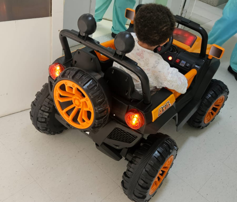 O carrinho elétrico, acionado por controle remoto, foi doado por uma servidora do bloco cirúrgico e é pilotado por alguém da equipe para levar a criança para sua cirurgia. A brincadeira reflete diretamente na rotina hospitalar.